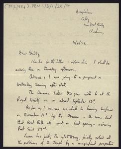 Written from Beaudesert Park, Henley-in-Arden. About activities at the school (going to church, playing chariot races on roller skates, the potato patch), his stamp collection, the weather, [Lilian and Herbert Pendlebury] coming to visit soon, and that he was the only boy leaving that term. Also asking Lilian to tell Nanny that he hoped she would read that letter, as he didn’t have time to write separately.