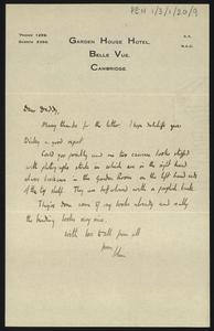 Written from Beaudesert Park, Henley-in-Arden, shortly after Lilian had visited. Thanking Lilian for honey and ‘Nada the Lily’ [book by Henry Rider Haggard]; wondering if Bumpus’ [a shop] had managed to get ‘She’ [book by Henry Rider Haggard]; sending news of other boys at the school (a birthday and illnesses); discussing the weather, examinations and golf. John also asked after [Herbert Pendlebury], Nanny, the birds, cat and Dicky [dog]; mentions Uncle Powell; asks if she had heard anything about Bligh or Mr Webb (a friend of Sir Philip) who had “helped him to save us at Malvern the year before last”; and wondered if they would go to Bradford to see aunt Violet and Bella in the holidays.