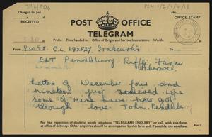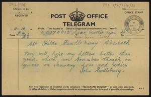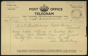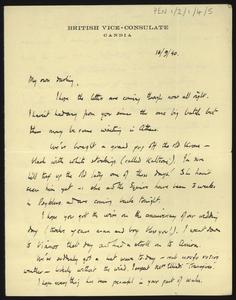 Written from St George’s School, Broadstairs, Kent. Telling Lilian about the boats that had been passing, and a wreck that they could see on the Goodwin [Sands]; commenting that the kitchen maid had caught a spy; asking for two boxes of [toy] Zulus, plasticine and cotton wool (to make headdresses) for his birthday, and for her to send a bib for Tubby and a lanyard for his whistle; telling Lilian that he had taken photographs of ship, aeroplanes, the lighthouse and house and planned to take one of the “dug out” [air raid shelter]; discussing a lecture on flying and asking her to tell [Herbert Pendlebury] that there was a picture of Rammeses II trying to fly and Icarus flaying into the sea; telling Lilian that a new boy (Hamilton Kerr) was very nice and he and other boys were playing and “making war” on the small dormitory, and that there was a nice new teacher called Mr Simon, and he had lent ‘Child of Storm’ [book] to Bunny. John also asked after Nanny, Dicky [dog?] was a whether he had a bath yet, and if the lovebirds had escaped again.