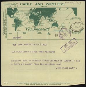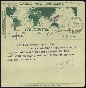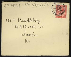 Sent from Knossos [where John had just started his Curatorship]. About their journey from Athens, the Palace [of Minos] being choked up with weeds, that [Duncan] Mackenzie had developed arteriosclerosis so could not be moved, and thanking Herbert for sending copies of ‘Aegyptiaca’ and asking him to send other books as John wanted to start an archaeological library at Knossos. Also telling Herbert that he had met Karo at the [BSA] tea party who wanted to be remembered to Herbert, that they had just missed [Charles and Isabel] Seltman and Winifred Lamb, and that Helen of Mycenae [Helen Dassis] had married a restaurant keeper from New York “with octagonal horn rimmed spectacles, a grim thought”.