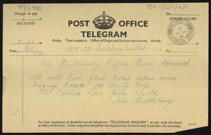 Written from St George’s School, Broadstairs, Kent. Thanking Lilian for a “the crimson lake” [book?]; telling her about boats, including destroyer warships, that he could see from the school, and that the air raid sirens had sounded but it turned out to be a fire; discussing visits by the other boys’ mothers, a possible tea party at Miss Whitwick’s, and asking her not to come too often as the other boys would be jealous; asking her to take him to see aeroplanes at Westgate, and to ask Basil to tea when she visits; telling her about exams, his garden, meeting the Barrons on a walk, that Basil had caught a butterfly, and that he was looking forward to getting model ships at the beginning of the holidays. John also asks Lilian to tell Nanny that he was looking forward to her visit tomorrow.
