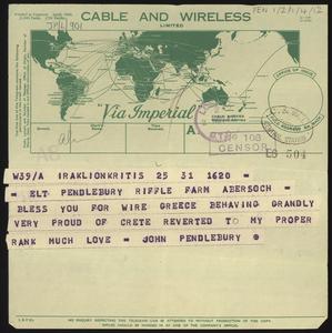 Sent from the British School at Athens. Asking Herbert to send him a copy of a report in the ‘Morning Post’ newspaper on John’s paper given [at the Open Meeting of the BSA] and telling him that [William] Miller had sent him a precis congratulating him on the paper. Also mentioning that they had a good time at Chalcis [Khalkís], over Cithaeron, Thebes and Euboea.