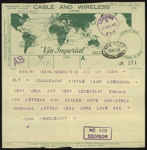 Written from the British School at Athens, wishing Herbert a happy Christmas and New Year and telling him about plans [for Hilda and John] to travel to Sicily (just after Christmas), Andros [Ándros] and Keos [Kéa] (when they get back from Sicily) and Ikaria later. They had planned to spend Christmas on Icaria [Ikaría] and Keos [Kéa] with Payne, but Payne could not go. Also telling Herbert that he, [Walter] Heurtley, [Theodore] Skeat and [Nicholas] Hammond had walked to Thebes from Athens setting off at 3am. Additionally mentioning that he was happy [Cambridge University Press] had proofs [that he had sent], Egyptian books and photographs [that Herbert had sent] had not arrived, and he had not heard from [Stephen] Glanville about [an article on Egypt and the Aegean that John had written].