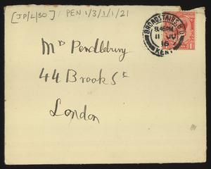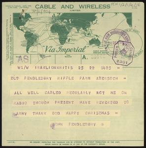 Written from St George’s School, Broadstairs, Kent . Asking for more stamps and writing paper, and listing the Christmas presents he wanted. John also tells his father that he and Basil were lending each other books for the holiday, how Tubby had translated “that night” into Latin, about his activities at the school, and that it was his turn to read in Chapel. John mentions a walk that Herbert and Lilian Pendlebury went on with him when they visited Broadstairs, and that Herbert had played football during that visit. John asks after “Dickie and the love birds” and Nannie, and says that Mummy must be excited about the holidays.