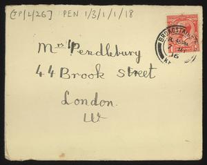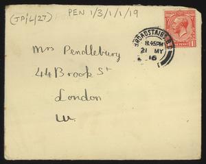 Written from St George’s School, Broadstairs, Kent. Thanking Lilian for letters; asking for a butterfly net, 2 Royal Flying Corps badges, and a bad egg to throw at Mr Martin’s white waistcoat “Basil’s idea”; telling her they saw several submarines escorted by a destroyer [warship], that he had hit “old Martin” with a bat, that Basil had received a telegram to say his parents had arrived safely in Plymouth, that Mrs Meyrick was “hung up at the Ritz”, and about his garden.