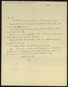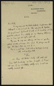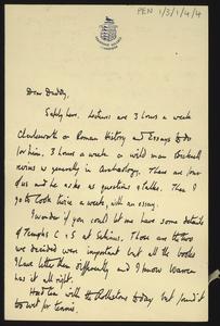 Sent from Hawks Club, Cambridge on “St Augustine’s day”. Thanking Herbert for notes and asking him to send a precis of an argument against wooden origin of Doric [columns]; discussing that work was going well but the standard in archaeology seemed to be low; telling Herbert that he didn’t know when his viva was but he hoped on Saturday, that [Charles] Seltman had written him a nice letter of recommendation, that he would like to go to ‘Antony and Cleopatra’ and asking Herbert to invite Ruth too, and that he was sorry Herbert would not be able to stay with Mrs Rule [in Cambridge].