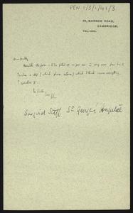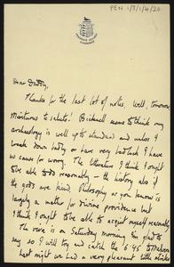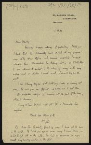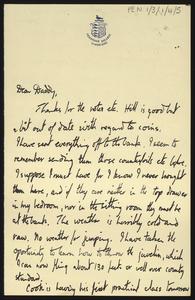 Sent from Pembroke College, Cambridge. Thanking Herbert for notes, and commenting on some by Hill about coins; discussing counterfoils which he thought he had sent to the bank; telling Herbert that the weather had been too bad for high jump so he had learnt how to throw a javelin, that [Arthur] Cook was holding his first practical class the next day, Jock [Lawson] had returned to the College after flu but was not teaching yet, and John had met the secretary of the British School [at Athens] [M. S.] Thomson about a studentship; and also mentioning plans for Herbert to visit on Saturday.