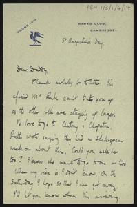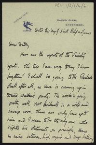 Sent from Hawks Club, Cambridge. Telling Herbert that he had been [to London] the day before and went to the [British Museum], practiced high jump at Queens’ [sports club], acted in a play which was a great success and about fooling around wearing costumes from the play on Liverpool Street train station. Also about books he had been reading, a paper on Hybrias the Cretan which John presented to “the Society”, a “show” [sporting competition] against [Trinity] Hall College, thanking Herbert for notes and asking how many people (other than Aunt Ruth who was definitely coming) would be coming to the Varsity sports match. Additionally mentioning he was going to Rex’s for tea.