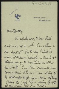 Sent from Hawks Club, Cambridge. Discussing plans to go to Malvern (13 Mar) and Hunstanton (18 Mar), asking if Tom [Livingston-] Learmonth could come to Malvern and saying he had asked the Headmaster [of Malvern College] for permission to use the [athletics] track; telling Herbert that he had been asking about studentships, and about his lectures that term (from [Charles] Seltman, [Arthur] Cook, Sills and Jock [Lawson]). Also telling Herbert that he was sorry that Ruth could not come on the 19th [of Feb with Herbert], that a Greek trip was happening, that there was deep snow in Cambridge, he was doing around 7 hours work a day, that he had a good book by Sir Charles Walston on Alcamenes the Sculptor, and that he was enclosing a letter [from or to] Uncle Edward.