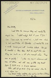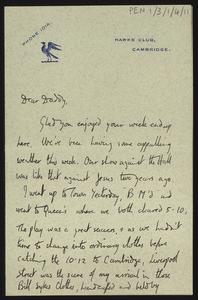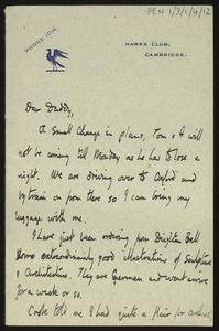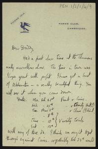 Sent from Hawks Club, Cambridge. Thanking Herbert for letters and notes, and asking for further notes on architecture in southern Italy; telling Herbert that he was applying for Crower and Warr studentships to work on Creto-Egyptian relations or Greek athletics, that [Arthur] Cook was pleased with John’s work and would put in a good word for his election [to a studentship], and that there would be a Founder’s Feast when Herbert visits in June; discussing dates for going [to Malvern] in June, and that he would be going to Kings [College] Ball so wouldn’t be able to get home before the Southern [athletics] Championships on the 18th [of June].