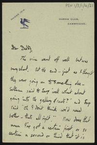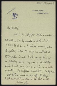 Sent from Hawks Club, Cambridge. Telling Herbert about a change in plans for Tom [Livingston-Learmonth] and him [going to Malvern], that he had ordered a German [book of] good illustrations of sculpture and architecture, that [Arthur] Cook had told him that he had a flare for archaeology, and that books by Henderson and Dobson were very good. Also about his performance in the athletics cup, that Pip [Powell] had hurt himself in the long jump, and about people who would come “to our dance” [in Malvern, from Cambridge] and books that John would bring to Malvern.
