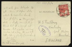 Written in four parts from Vienna, from the train, Budapest, and the train to Belgrade. Telling Herbert about the hotel, buildings, people and food in Vienna, and that he [and Bob Dixon] had walked to the Danube and been to an opera; about the hotel, visiting the city, and trouble getting a Bulgarian visa for Bob Dixon in Budapest; mentioning that the manager of the hotel in Vienna told John that a Mrs Pendlebury used to stay there, and that his suitcase had broken but then was mended at the hotel in Pest; telling Herbert that they were having a “pro Ally” conversation with a French man and 2 Serbians in broken English on the train to Belgrade and Rothmere and Hungary [Lord Rothmere had written a newspaper article arguing that Hungary should regain territory lost at the end of the First World War]; and telling Herbert that he had been arrested by Serbian police for trying to stay in Belgrade on a transit visa but had been helped by a Serbian he met on the train.