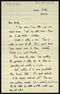 Sent from Pembroke College, Cambridge. Thanking Herbert for notes; discussing plans for Herbert visiting from the 19th [Feb] and discussing progress with his studies including lectures from [Charles] Seltman and an essay set by [Arthur] Cook; telling Herbert that Jock [Lawson] was still ill with flu, and that John would be going [to London] on Saturday 26th [Feb] to go to the [British Museum] and Queens’ [sports club] and to act in a play called ‘In the Library’ by W W Jacobs with Jim and David.