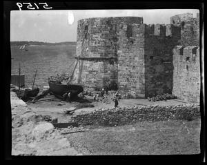 Part of a set of images taken by F.W. Hasluck in 1908 when he visited Aenos, Phocaea, Lemnos and Mytilene to document Frankish monuments. The original description in the SPHS register reads: "Mytilene: corner tower on sea".