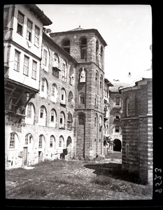 Part of a series of images taken by F.W. Hasluck during the course of his visit to Mount Athos in 1911. The original description in the SPHS register reads: "Athos: Zográphou: E. side of court with clock tower".