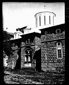 Part of a series of images taken by F.W. Hasluck during the course of his visit to Mount Athos in 1911. The original description in the SPHS register reads: "Athos: Chiliandári: well house & church".