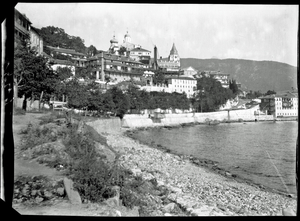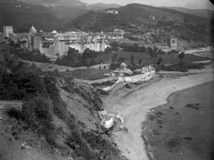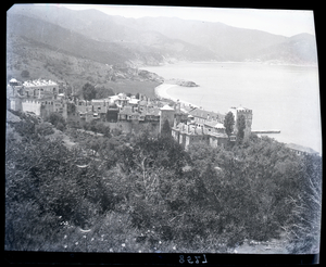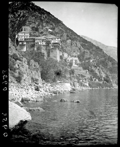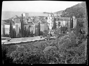 Part of a series of images taken by F.W. Hasluck during the course of his visit to Mount Athos in 1911. The original description in the SPHS register reads: "Athos: Esphigménou: general view from land".