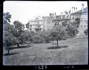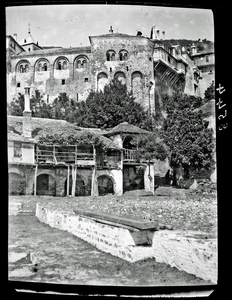 Part of a series of images taken by F.W. Hasluck during the course of his visit to Mount Athos in 1911. The original description in the SPHS register reads: "Athos: 1911. Xeropotámu, NW corner of court, c. 1800".