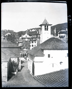 Part of a series of images taken by F.W. Hasluck during the course of his visit to Mount Athos in 1911. The original description in the SPHS register reads: "Athos: Vatopédi: court with bell tower".