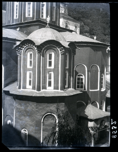 Part of a series of images taken by F.W. Hasluck during the course of his visit to Mount Athos in 1911. The original description in the SPHS register reads: "Athos: Koutloumousíou: NE apsidal dome of church".