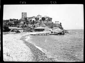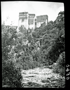 Part of a series of images taken by F.W. Hasluck during the course of his visit to Mount Athos in 1911. The original description in the SPHS register reads: "Athos: Simopetra: general view, seaward side".