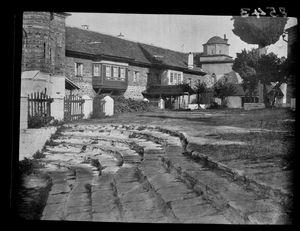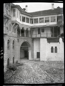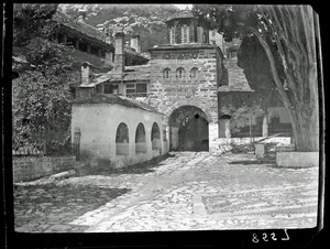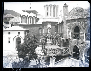 Part of a series of images taken by F.W. Hasluck during the course of his visit to Mount Athos in 1911. The original description in the SPHS register reads: "Athos: Pantokratoros: view in court".