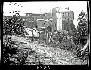 Part of a series of images taken by F.W. Hasluck during the course of his visit to Mount Athos in 1911. The original description in the SPHS register reads: "Athos: Ivéron: tower of 'arsenal'".