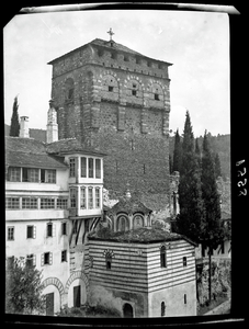 Part of a series of images taken by F.W. Hasluck during the course of his visit to Mount Athos in 1911. The original description in the SPHS register reads: "Athos: Chiliandári: great tower".