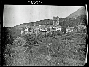 Part of a series of images taken by F.W. Hasluck during the course of his visit to Mount Athos in 1911. The original description in the SPHS register reads: "Athos: Ivéron: general view".