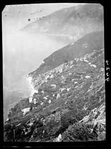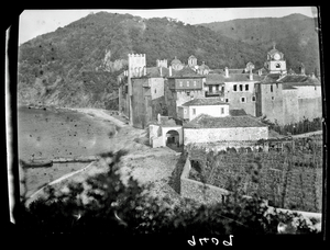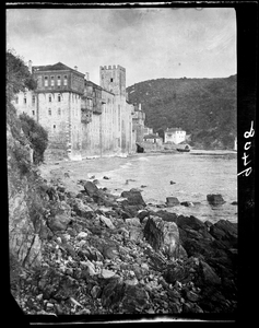 Part of a series of images taken by F.W. Hasluck during the course of his visit to Mount Athos in 1911. The original description in the SPHS register reads: "Athos: Gregoríou, general view from sea".