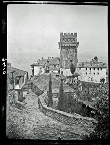 Part of a series of images taken by F.W. Hasluck during the course of his visit to Mount Athos in 1911. The original description in the SPHS register reads: "Athos: Caracállou, the great tower".