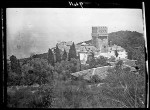 Part of a series of images taken by F.W. Hasluck during the course of his visit to Mount Athos in 1911. The original description in the SPHS register reads: "Athos: Dionysíou: general view from W.".