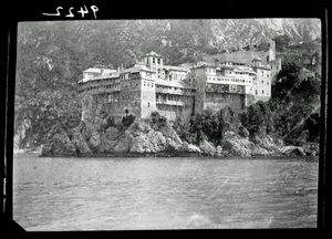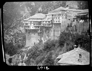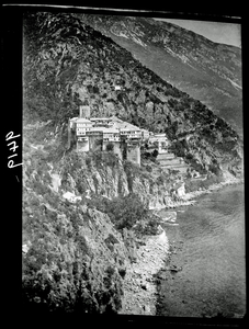 Part of a series of images taken by F.W. Hasluck during the course of his visit to Mount Athos in 1911. The original description in the SPHS register reads: "Athos: Dionysíou: general view from S. ".