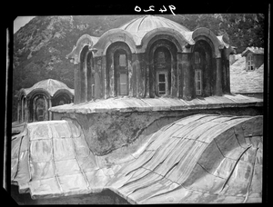 Part of a series of images taken by F.W. Hasluck during the course of his visit to Mount Athos in 1911. The original description in the SPHS register reads: "Athos: Chiliandari, caltolicon, N. side from E.".