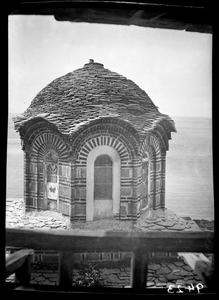 Part of a series of images taken by F.W. Hasluck during the course of his visit to Mount Athos in 1911. The original description in the SPHS register reads: "Athos: Gregoríou, dome of chapel, c. 1800".