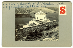 Part of a group of images from Hasluck's travels to the Marmara Islands in 1907. The original description in the SPHS register reads: "Marmara Islands (Proconnesus Marmara) Palatia, S. Nicolas εν τη Γέννα from W. (JHS xxix.III)".