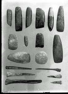 Part of a collection of images from Wace & Thompson's excavation at Tsangli 1910. The original description in the SPHS register reads: "Wace and Thompson Prehist. Thess. Pp118-119 stone axes from Tsangli".