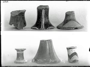 Part of a collection of images from Wace & Thompson's excavations at Tsangli 1910. The original description in the SPHS register reads: "Wace and Thompson: Prehist. Thessaly, stems of fruit stands, TC".