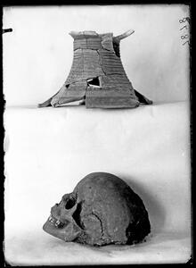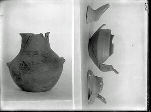 Part of a collection of images from Wace and Thompson's excavations at Halos/Halmyro 1912. The original description in the SPHS register reads: "Halmyro: Thessaly. ringed stand of trefoil lipped jug". The image also shows a skull.