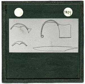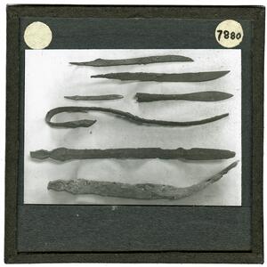 Part of a collection of images from Wace and Thompson's excavations at Halos/Halmyro 1912. The original description in the SPHS register reads: "Halmyro: Thessaly. bronze fibulae and iron knife blades".