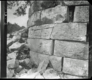 Part of a series of images from the island of Thasos by John ff. Baker-Penoyre during his visit in 1907 to map areas of archaeological interest, particularly the site of Limena, and to conduct investigations of ancient architecture. The original description of the image in the SPHS register reads: "Thasos: Limenas: Temple basis, detail of wall, near".