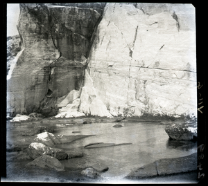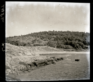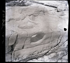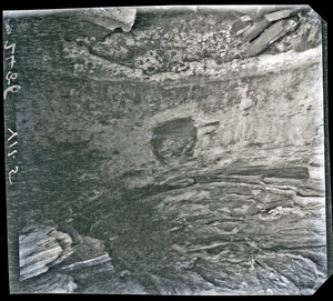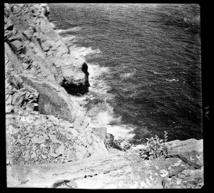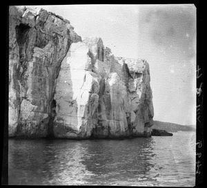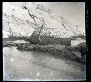 Part of a series of images from the island of Thasos by John ff. Baker-Penoyre during his visit in 1907 to map areas of archaeological interest, particularly the site of Limena, and to conduct investigations of ancient architecture. The original description of the image in the SPHS register reads: "Thasos: Alyki, marble quarries on point, hole for attachment of marble boats".