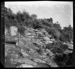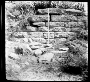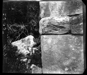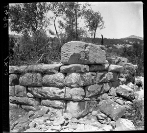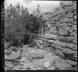 Part of a series of images from the island of Thasos by John ff. Baker-Penoyre during his visit in 1907 to map areas of archaeological interest, particularly the site of Limena, and to conduct investigations of ancient architecture. The original description of the image in the SPHS register reads: "Thasos: Astris, (near) στήν Τρυπητήν, detail of wall of Purgos".