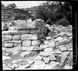 Part of a series of images from the island of Thasos by John ff. Baker-Penoyre during his visit in 1907 to map areas of archaeological interest, particularly the site of Limena, and to conduct investigations of ancient architecture. The original description of the image in the SPHS register reads: "Thasos: Alyki: Hellenic site between Alyki and Έχίδια, west wall".