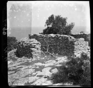 Part of a series of images from the island of Thasos by John ff. Baker-Penoyre during his visit in 1907 to map areas of archaeological interest, particularly the site of Limena, and to conduct investigations of ancient architecture. The original description of the image in the SPHS register reads: "Thasos: Στο ποτό (near) details of church of Panagia, on sea".