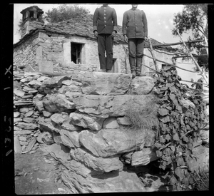 Part of a series of images from the island of Thasos by John ff. Baker-Penoyre during his visit in 1907 to map areas of archaeological interest, particularly the site of Limena, and to conduct investigations of ancient architecture. The original description of the image in the SPHS register reads: "Thasos: Theologo (near) church of Άγιος Θεοδώρος".