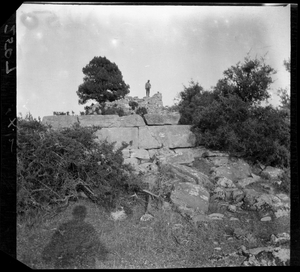 Part of a series of images from the island of Thasos by John ff. Baker-Penoyre during his visit in 1907 to map areas of archaeological interest, particularly the site of Limena, and to conduct investigations of ancient architecture. The original description of the image in the SPHS register reads: "Thasos: Alyki: Σχίδια, S.E. angle of square Purgos"