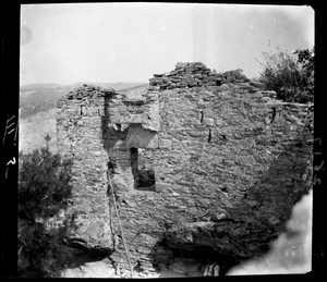 Part of a series of images from the island of Thasos by John ff. Baker-Penoyre during his visit in 1907 to map areas of archaeological interest, particularly the site of Limena, and to conduct investigations of ancient architecture. The original description of the image in the SPHS register reads: "Thasos: Alyki: Θυμωνία, round tower, entrance".