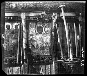 Part of a series of images from the island of Thasos by John ff. Baker-Penoyre during his visit in 1907 to map areas of archaeological interest, particularly the site of Limena, and to conduct investigations of ancient architecture. The original description of the image in the SPHS register reads: "Thasos: Potamia Scala, detail of church".