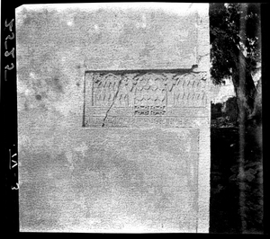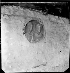 Part of a series of images from the island of Thasos by John ff. Baker-Penoyre during his visit in 1907 to map areas of archaeological interest, particularly the site of Limena, and to conduct investigations of ancient architecture. The original description of the image in the SPHS register reads: "Thasos: Castro, (Calubia) relief outside church".